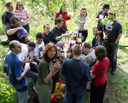 Entsprechend enthusiastisch stürmte die Horde anschließend den Nachbarhügel, wo man trotz mehr als zehnminütiger Wanderschaft fast ohne größere Ausfälle ankam. Alte Bekanntschaften wurden begossen und neue geschlossen (und anschließend ebenfalls begossen). Ansonsten wurde das schöne Wetter genossen und bei der Gelegenheit auch gleich noch begossen.