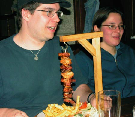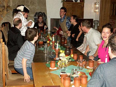 Noch schnell die üblichen Drohungen ins Gästebuch geschrieben (Wir kommen wieder ... muhaha!), und schon war es wieder an der Zeit, tränenreichen Abschied zu nehmen. Ach, warum mussten wir nur scheiden (schnief) ... Doch zagt nicht, ihr Ritter und Edeldamen der Völlerei und Verlustierung, denn wie jeder weiß, gibt es für jede Erfolgsstory (und für schlechte Horrorfilme) eine Fortsetzung also seid dabei, wenn wieder die Zinnen vibrieren und die Köche ächzen: demnächst in einem Theater in Ihrer Nähe! Auf 2005!