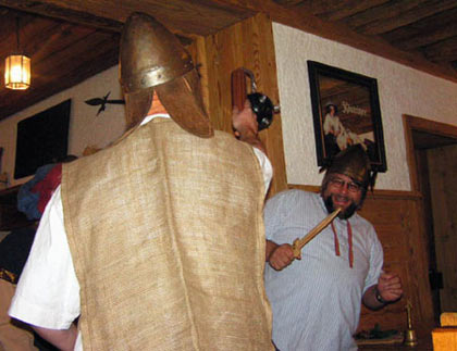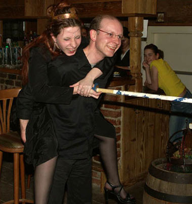 Dem Tage folgte ein Abend, wie er stilsicherer nicht hätte sein können: Zu mittelalterlichem Braten und Eintopf gab es mittelalterliche Musik eines mittelalterlichen Barden, diverse Leute wurden zu mittelalterlichen Burgfräuleins, Vorkostern oder Hofnarren ernannt, es gab ein mittelalterliches Turnier samt mittelalterlicher Unterwäschemodenschau, und allgemein wurde mehr geschunkelt und geklatscht als bei einem Heino-Konzert.
