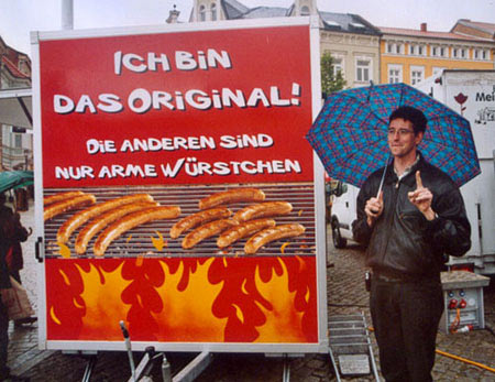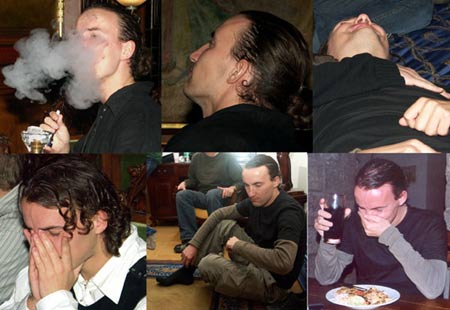 Er: widmete sich sehr häufig halluzinogenen Drogen, meditierte oder betete (gen Paris vermutlich!), ließ sich von fremden Männern ins Reich der Sinne entführen ... noch ein Bilderrätsel, wessen Arm ist es diesmal? Kandidaten gäbe es ja mehrere ... :-)) oder rang mit dem Essen, der Müdigkeit oder auch mit beidem gleichzeitig ... Leider nicht fotografisch dokumentiert ist im übrigen, wie er im Schwimmbad (vergeblich) versuchte, 6-jährige zu ertränken! Insofern ist es um so erstaunlicher, von welch hoher, ästhetischer und schriftstellerischer Qualität der vorstehende Beitrag zeugt! ... Aber Karl May war ja auch nie im wilden Westen ... Euer Tapir, aka Steffen, der schon die nächste Schweinerei in der Pipeline hat ... Januar 2006 ... spätestens... |